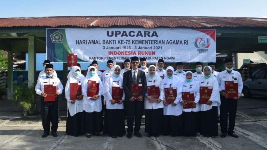 NGAWI — Dalam rangka Hari Amal Bakti Kementerian Agama Republik Indonesia ke-75 tahun 2021, digelar upacara bendera di Kantor Kementerian Agama (Kemenag) Ngawi, Selasa (05/01/2020).