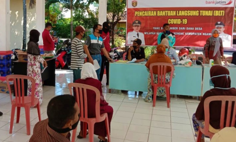 NGAWI — Bertempat di pendopi kecamatan Kendal, ratusan Keluarga Penerima Manfaat dari 10 desa di wilayah kecamatan Kendal berkumpul untuk menerima penyalurna Bantuan Langsung Tunai (BLT) Dana Desa, Jumat (26/06/2020).