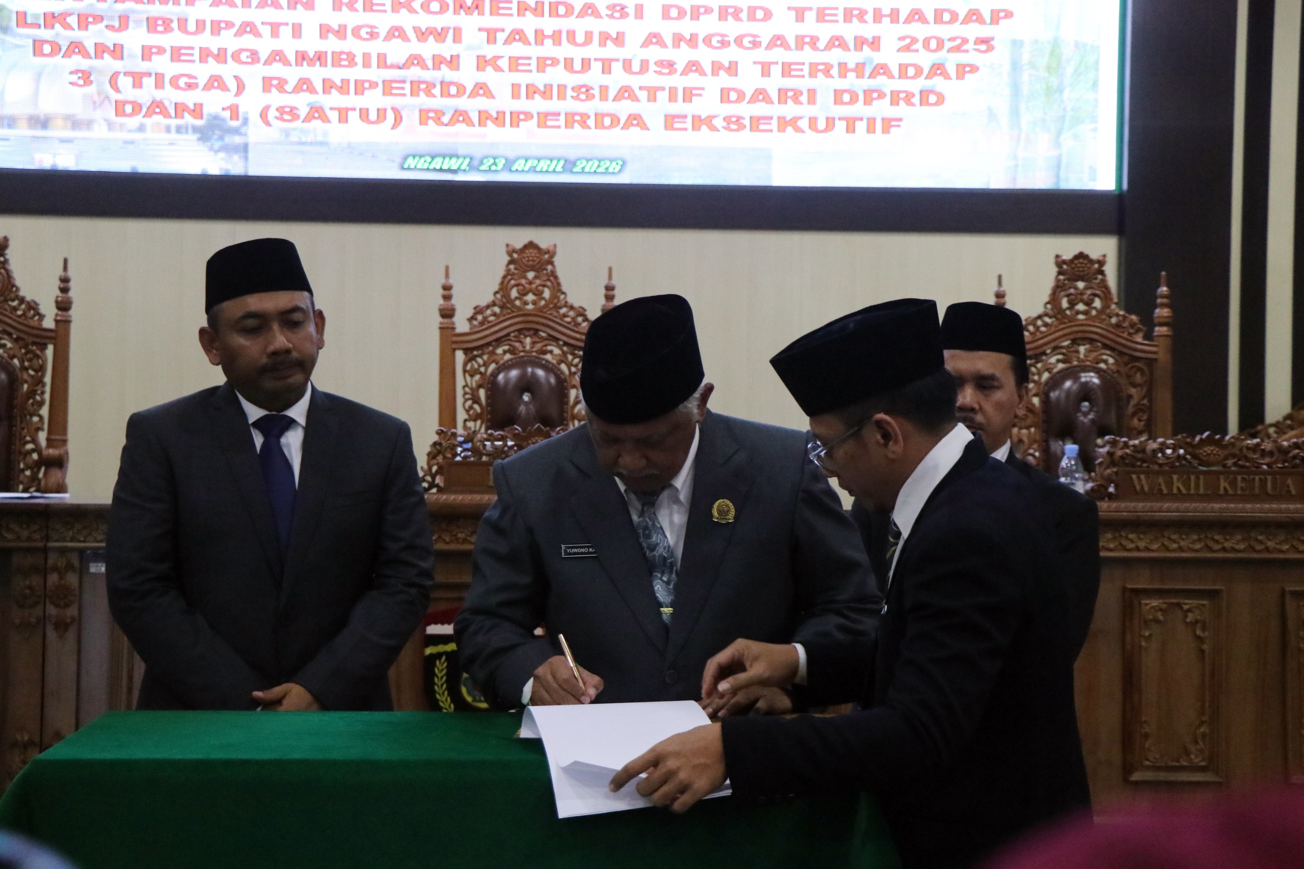 Sinergi legislatif dan eksekutif di Kabupaten Ngawi kembali diperkuat melalui rapat paripurna DPRD dengan agenda penyampaian rekomendasi terhadap LKPJ Bupati Tahun Anggaran 2025 serta persetujuan empat Rancangan Peraturan Daerah (Ranperda), Kamis (23/4/2026).