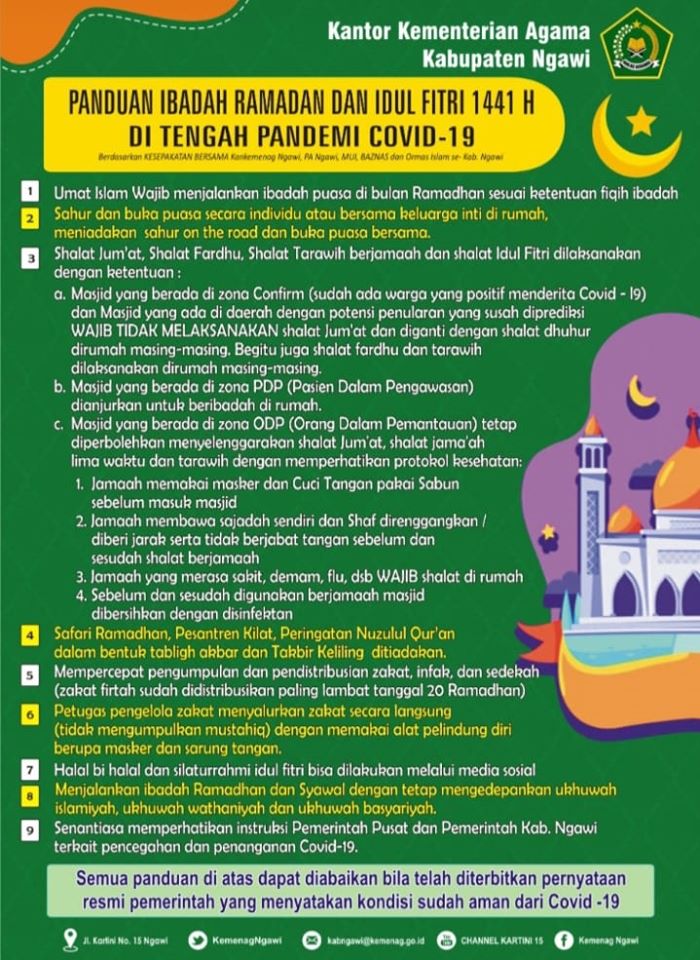 NGAWI — Kantor Kementerian Agama (Kemenag) Kabupaten Ngawi mengeluarkan panduan ibadah ramadan dan idul fitri 1441 H di tengah pandemi COVID-19 yang didasarkan pada kesepakatan bersama beberapa elemen di kabupaten Ngawi.