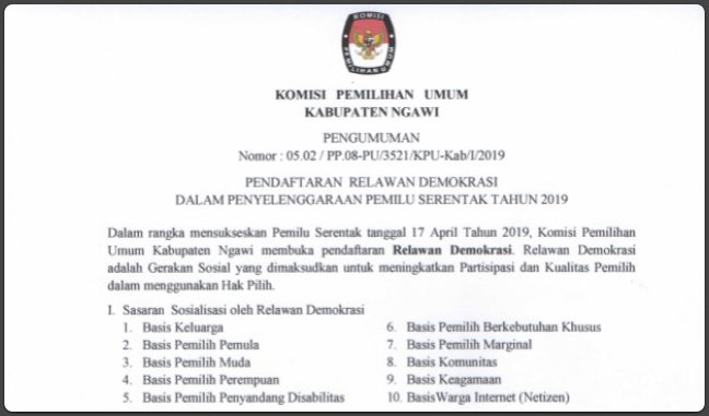Dalam pengumuman bernomor 05.02/PP.08-PU/3521/KPU-Kab/I/2019 tertanggal 10 Januari 2019 tersebut, KPU Ngawi menyebutkan bahwa Relawan Demokrasi merupakan gerakan sosial yang dimaksudkan untuk meningkatkan partisipasi dan kualitas pemilih dalam menggunakan hak pilih.