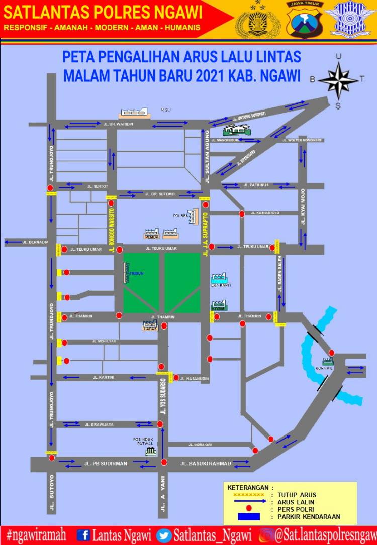 Akses masuk mulai dari perempatan Kartini – Hasanudin ditutup, begitu pula semua titik yang mengarah ke alun-alun Ngawi sebagaimana telah dihimbau sebelumnya oleh Polres Ngawi.