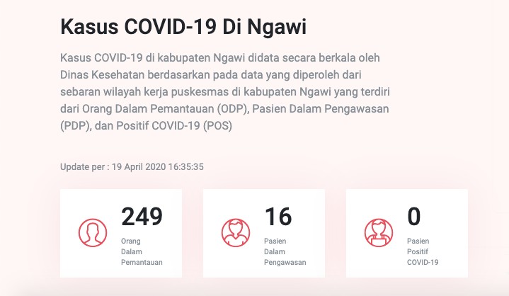 NGAWI — Update kasus COVID-19 kabupaten Ngawi per 19 April 2020, Pasien Dalam Pengawasan (PDP) dan Orang Dalam Pemantauan (ODP) masing-masing bertambah 1 orang.