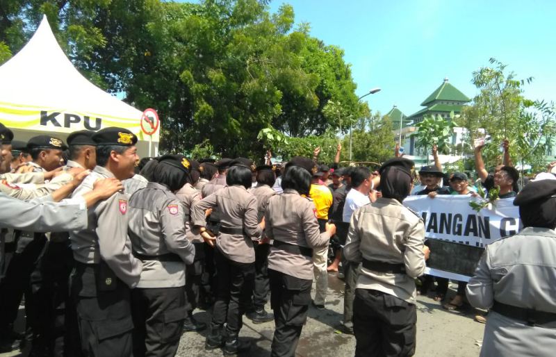 Tidak terima aksinya dihentikan, para pendemo semakin membabi buta, membakar ban, membawa kayu, plastik berisi air yang disimulasikan sebagai batu, serta spanduk bertuliskan “Petugas Curang”.