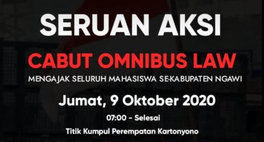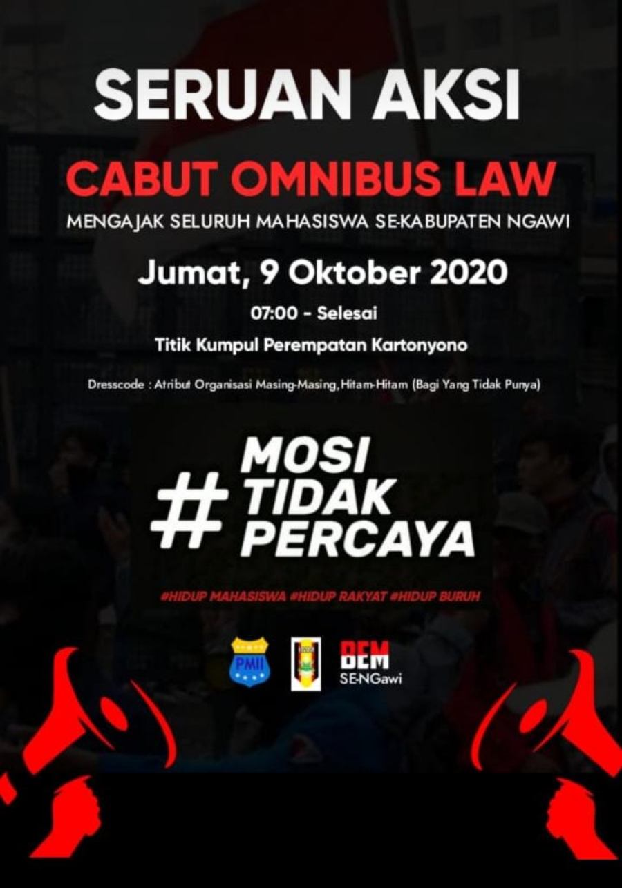 Seruan aksi tersebut bertuliskan CABUT OMNIBUS LAW mengajak seluruh mahasiswa se-kabupaten Ngawi, Jumat 9 Oktober 2020 07.00 – selesai.