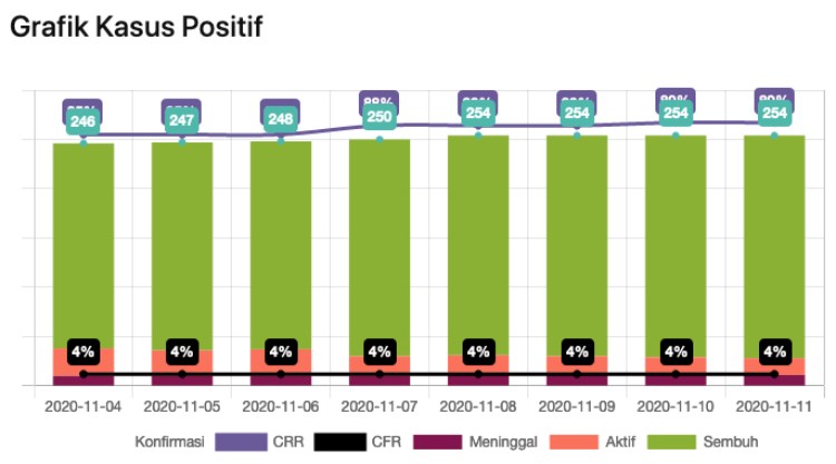 Data rincian kasus konfirmasi hingga hari ini, kumulatif tercatat sebanyak 254 kasus, konfirmasi dinyatakan sembuh/selesai sebanyak 226, konfirmasi aktif sebanyak 17 kasus, dan dilaporkan meninggal sebanyak 11 kasus.